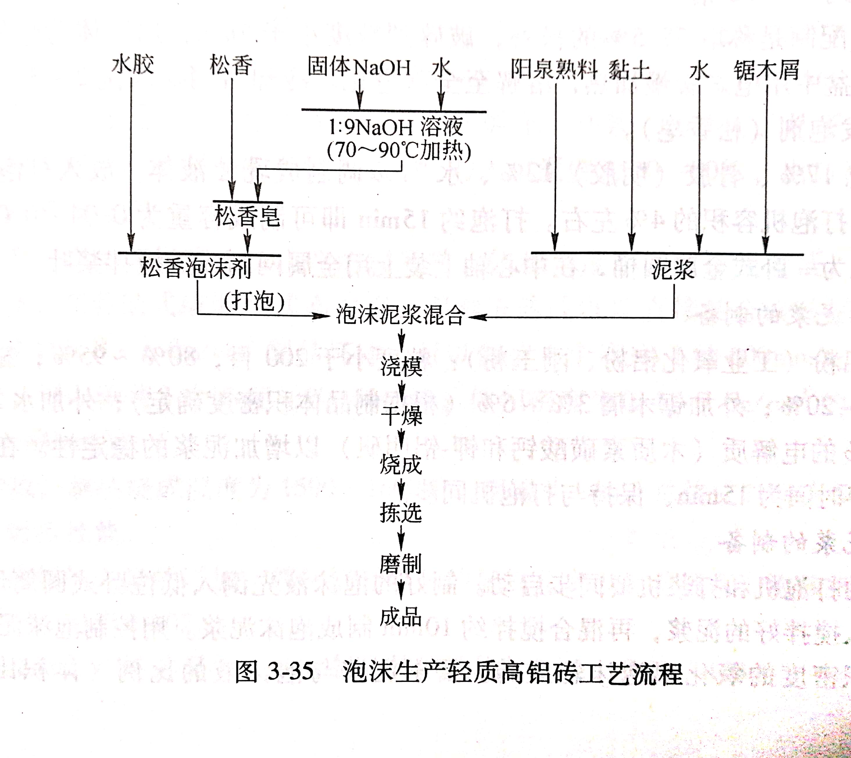 用泡沫法可以生產(chǎn)體積密度較低的(0.4~0.8g/cm')氧化鋁輕質(zhì)磚。 這種體積密度低的氧化鋁輕質(zhì)磚,使用溫度高、熱導(dǎo)率低,是各種高溫窯爐使用的保溫節(jié)能爐襯耐火材料,其生產(chǎn)工藝流程如圖3-35所示。