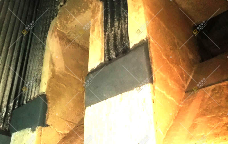 3、將可塑料用非常干凈的***切片,新鮮的一面貼于修補部位,然后用氣動錘或手錘搗打緊實,料坯的鋪排應錯縫緊靠,搗打完后應搗打料坯的接縫,不能出現縫隙,修補面全部貼好后,用錘反復搗實,直到料坯還表面出現潮濕現象為止。搗打時注意邊沿,不能搗打原有的耐火材料,后將整個修補面打實成一個光滑的平面。